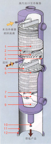 2、支撐柵板 3、液體收集器 4、集液環(huán) 5、多級(jí)槽式液體分布器 6、填料壓圈 7、支撐柵板 8、蒸汽入口管 9、塔底 10、至再沸器循環(huán)管 11、裙座 12、底座環(huán) 此結(jié)構(gòu)適合于直徑大于等于800mm的填料塔。 |